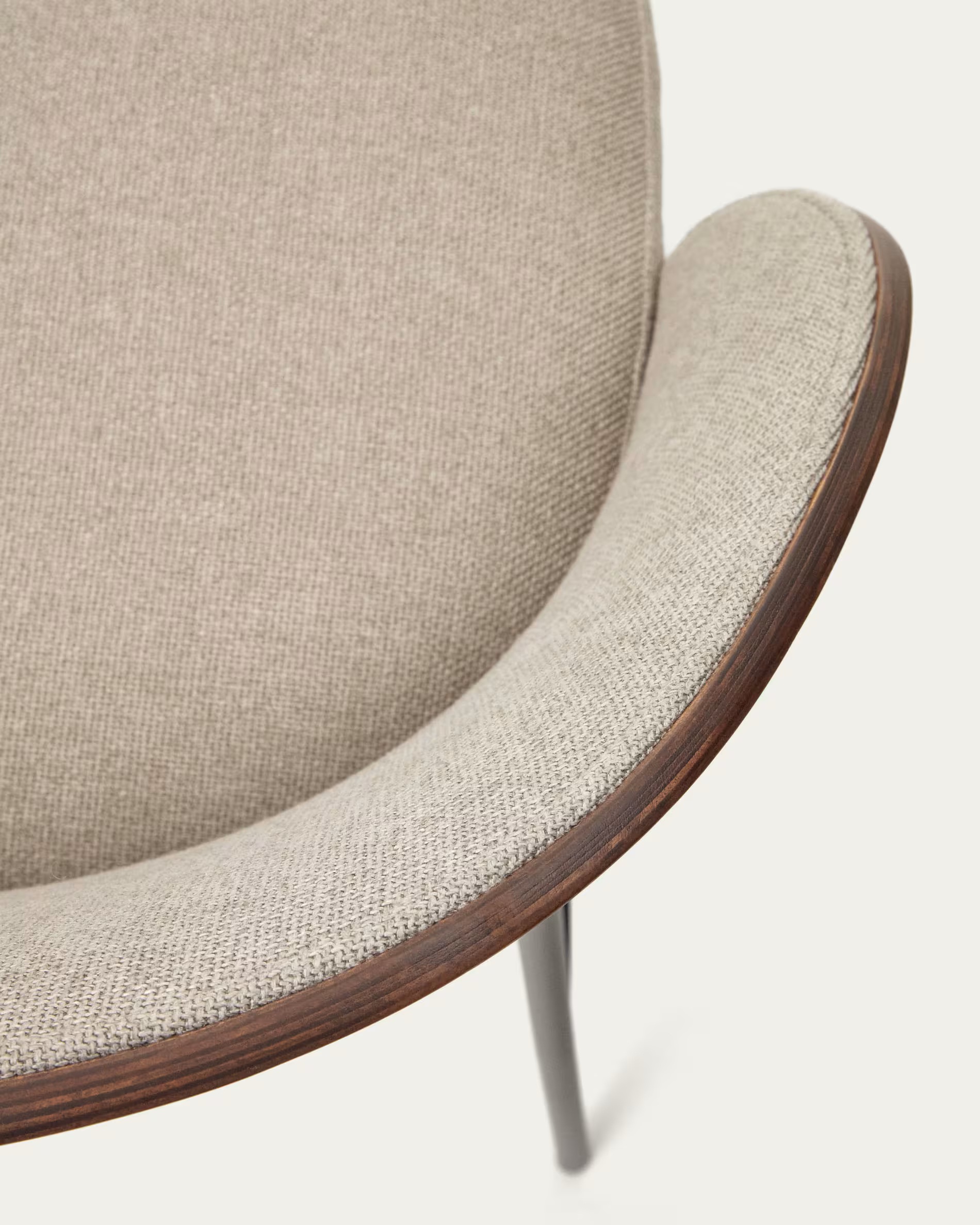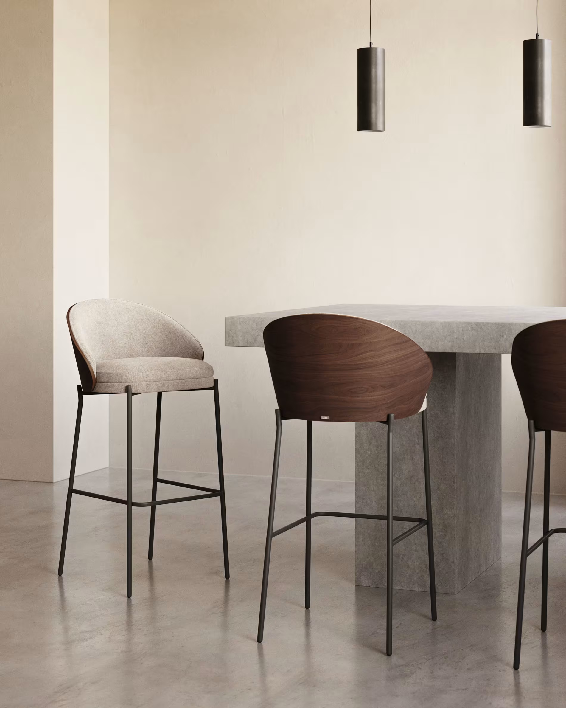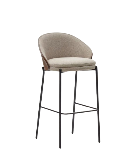Taburete Eamy de chenilla marrón claro chapado en fresno acabado negro y metal negro 77 cm