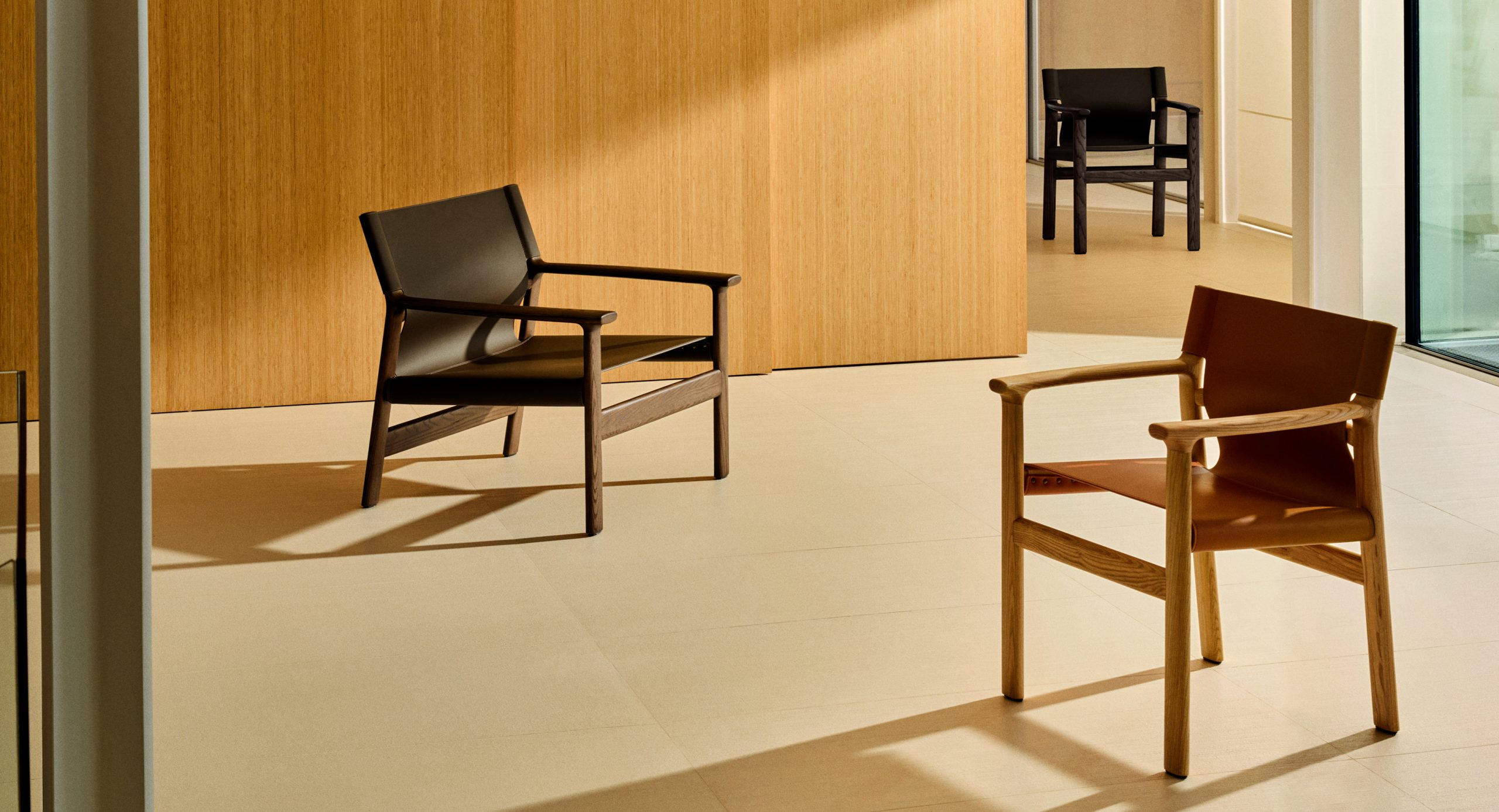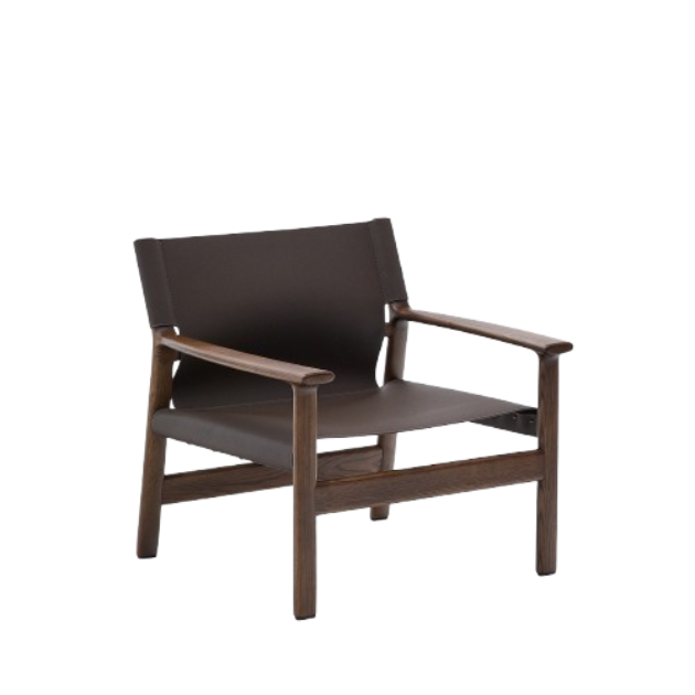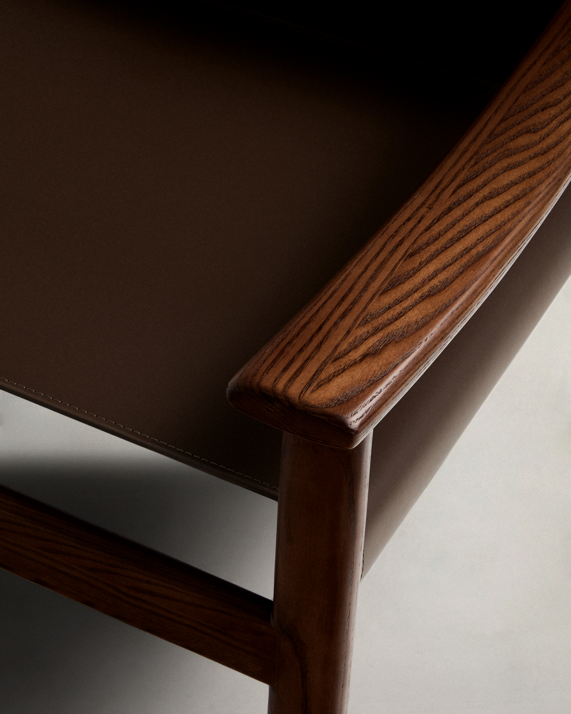 Butaca Jan de fibras de cuero reciclado marrón oscuro y madera maciza de fresno con acabado tono nog