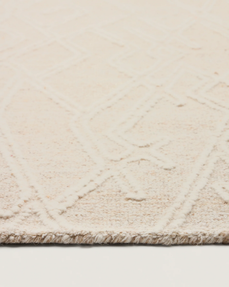 Esta alfombra destaca por su efecto bordado, aportando textura y relieve que transforman cualquier espacio. Elaborada en lana 100%, ofrece una superficie cálida y suave bajo los pies, perfecta para crear ambientes acogedores y sofisticados. Cada pieza está tejida a mano, lo que la convierte en un producto exclusivo con ligeras variaciones propias del proceso artesanal.