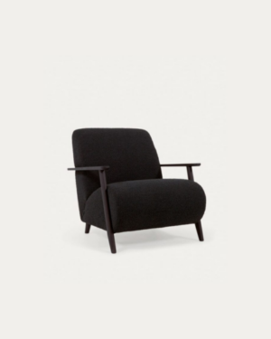 Butaca Meghan de borreguito negro y patas de madera maciza de fresno con acabado wengué