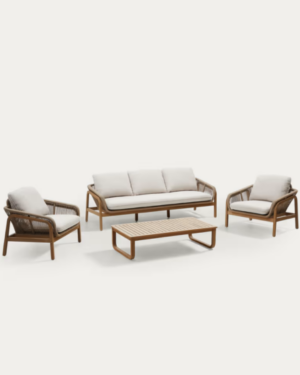Set Vellana sofá 3 plazas, 2 sillones y mesa centro madera maciza acacia FSC 100% cuerda beige