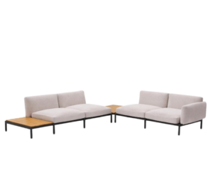 Sofá modular rinconero exterior Sorells 4 plazas tapizado beige y aluminio gris, con 2 mesas de teca